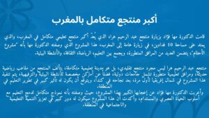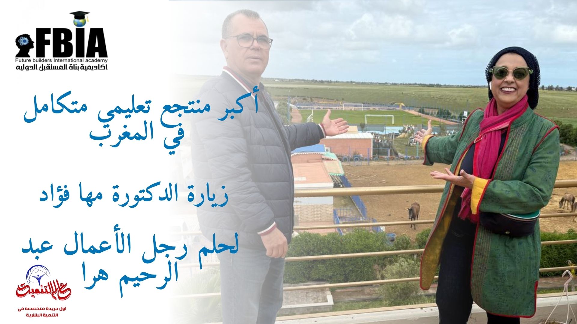 قامت الدكتورة مها فؤاد بزيارة منتجع رجل الاعمال المغربي عبد الرحيم هرا، الذي يُعدّ أكبر منتجع تعليمي متكامل في المغرب، والذي يمتد على مساحة 10 فدادين، في زيارة هامة إلى المغرب، هذا المشروع الذي وصفته الدكتورة مها بأنه “مشروع الأحلام”، يتضمن العديد من المرافق المتطورة، ويجمع بين التعليم، الرياضة، الثقافة، والأنشطة البيئية.