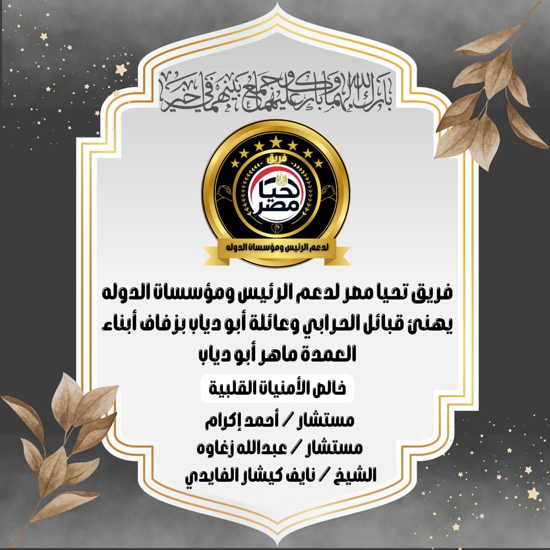 في مشهد يجمع بين الفرح الأصيل والعراقة القبلية، يتقدم فريق “تحيا مصر” لدعم الرئيس ومؤسسات الدولة، بخالص التهاني وأطيب التبريكات إلى قبائل الحرابي الكرام، وإلى عائلة أبو دياب العريقة بمركز أبو المطامير بمحافظة البحيرة، وذلك بمناسبة الاحتفال بزفاف أبناء العمدة/ ماهر أبو دياب الحرباوي.